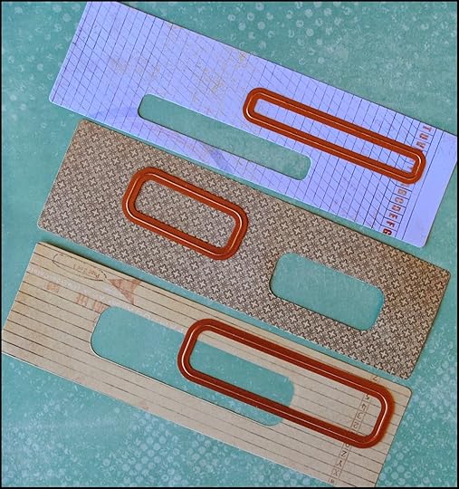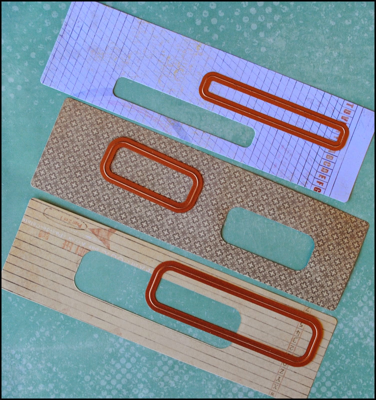Using dies #1, 2 and 3 from the Spellbinders A2 Curved Matting Basics B die set, I cut windows into each of the pages in random locations. This led to the book's title View Finder.