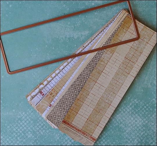 Using the border die from the Vintage Brocade Die set from Spellbinders, I cut double-sided, decorative paper into 7 ½ x 2 ¼ inch strips. These will serve as the pages of my book. I love the curved corners and plan to use these in landscape mode.