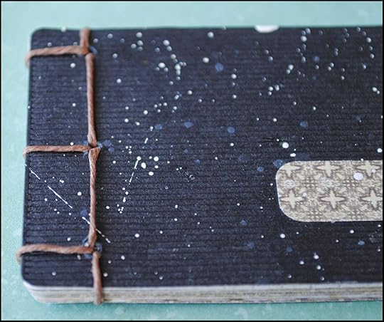 Trying out several different designs, I finally settled on one and glued the pieces to the cover. For a finishing touch, I randomly splattered the cover with some white paint.