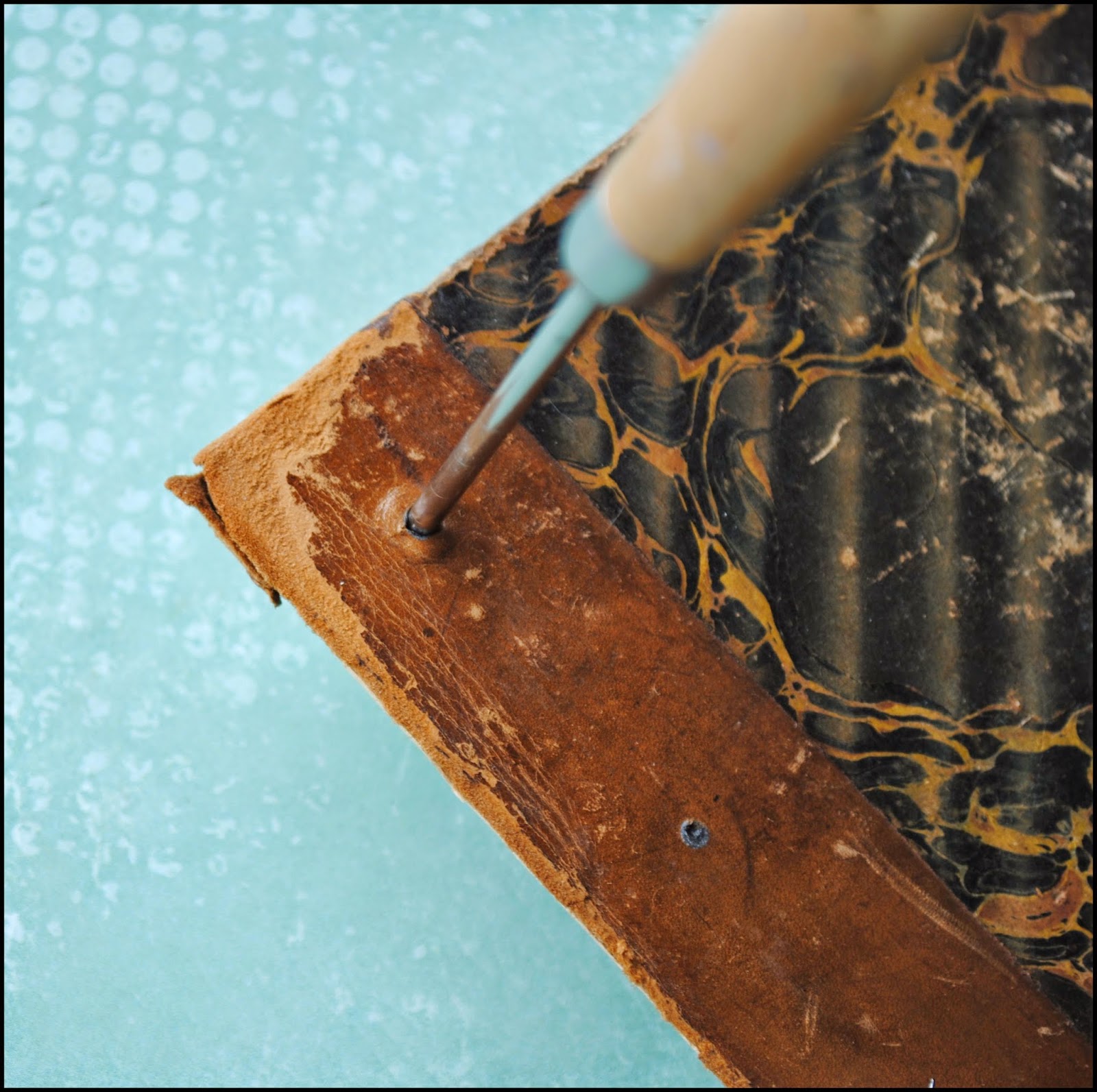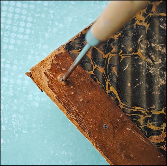Using an awl, I created holes through the cover to allow for the brad prongs.