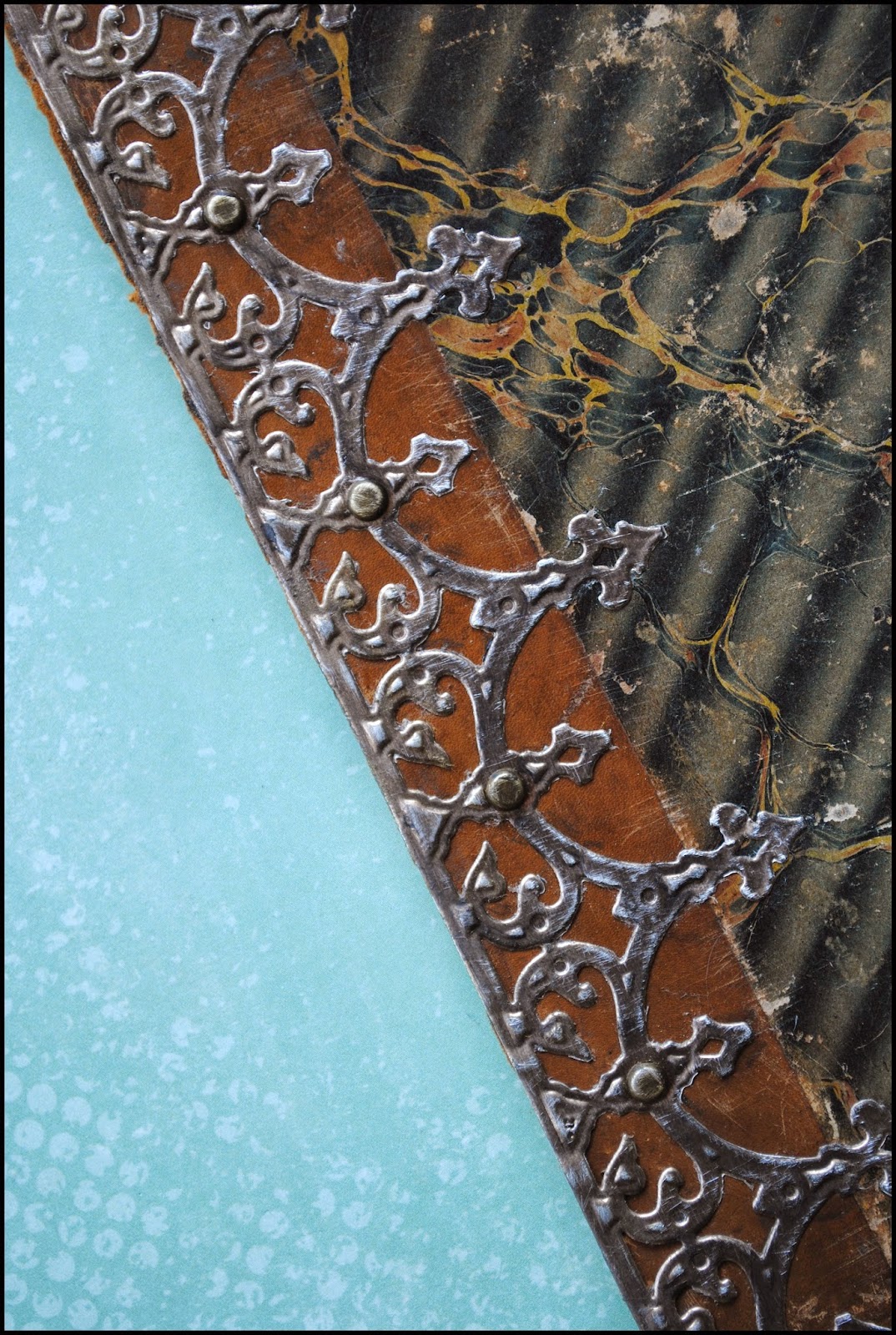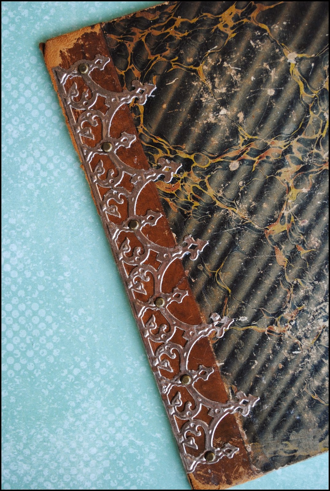 With a love of metal accents, I decided to attach the die cut using both adhesive and metal brads. I lined up the die cut to the leather edge of the book cover and marked six holes with a pen using the pre-cut holes in the die cut as a guide.