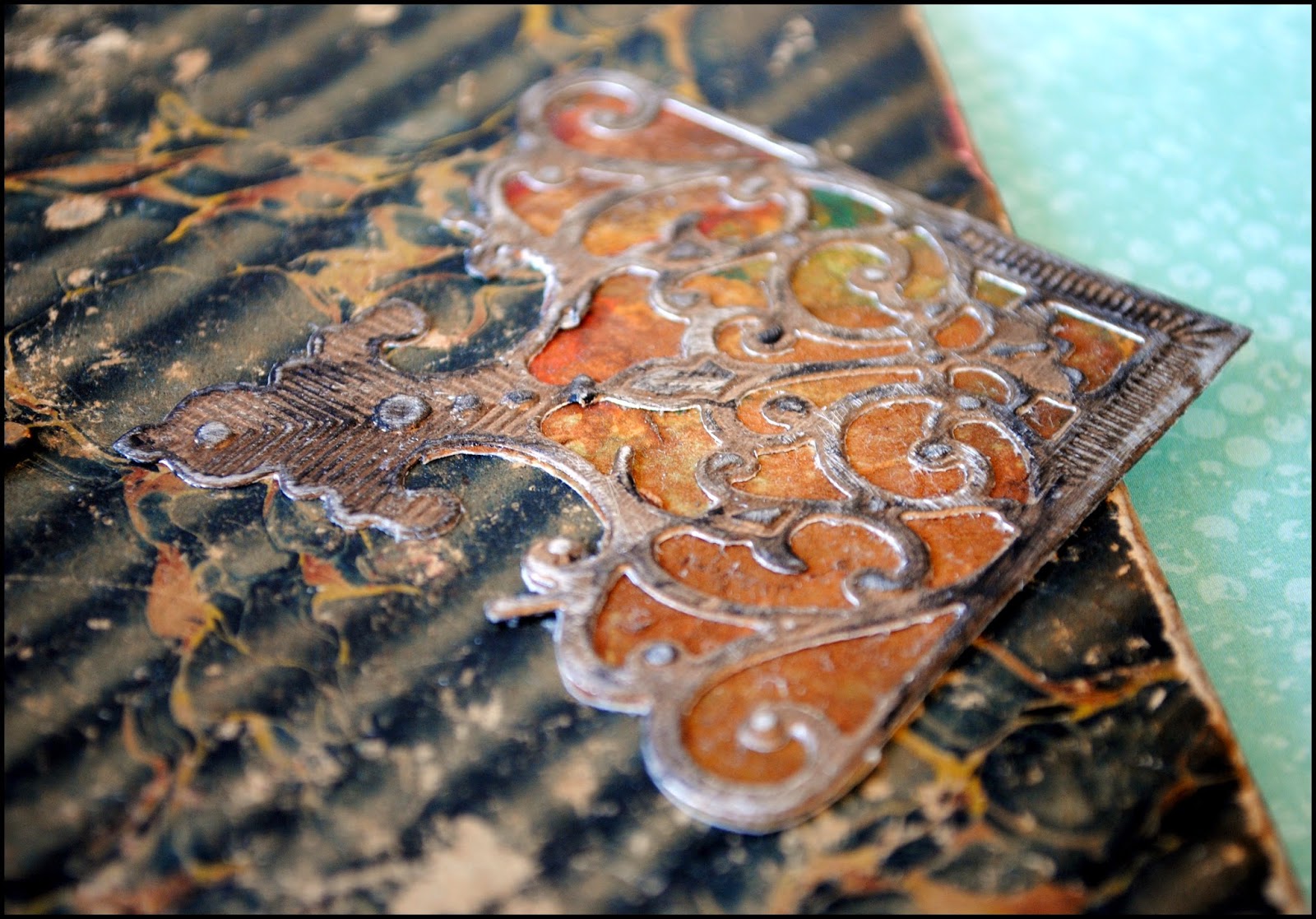 I distressed the die cut by running a sanding block over the embossed surface and adding some matte black paint using my fingers.