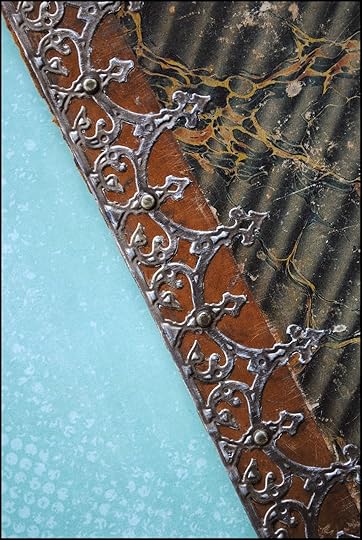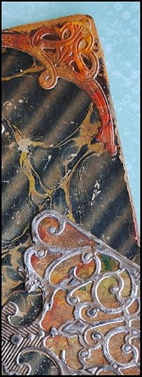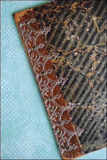I often use vintage book covers to create new books from scratch. In my stash is this beautiful cover, with naturally-aged marbled paper and leather accents. It seemed to me that elements from Spellbinders A Gilded Life collection would be the perfect match.