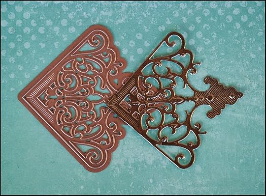 Using Spellbinders Antique Corner die, I cut and embossed the same pewter foil into a beautiful, filigreed shape. My idea was not to use it as a corner though.