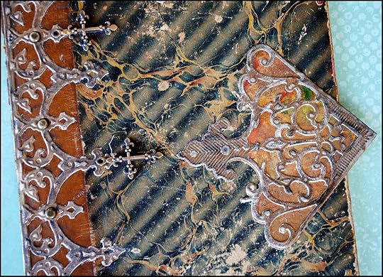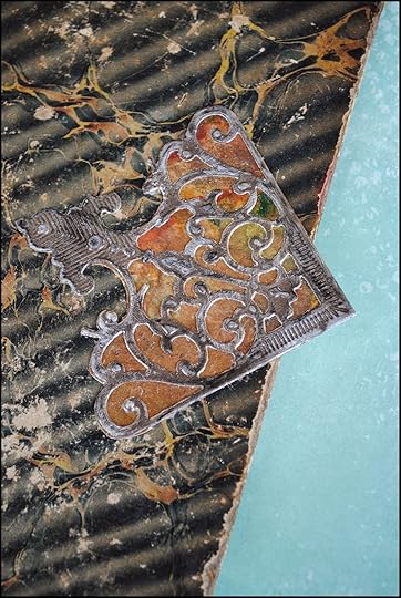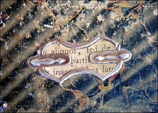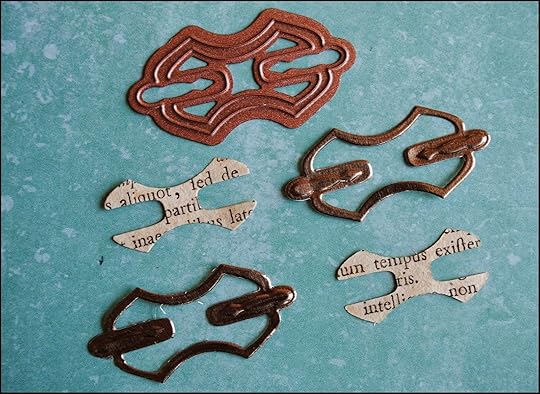The last element for the book cover was created by using die #1 from Spellbinders A2 Filigree Delight. Two pieces of pewter foil were cut and the outer portion of the die cuts saved. In addition, a vintage book page with Latin text was cut into 2 pieces using the same die, but only the inner portion of the die cuts were used for this project.