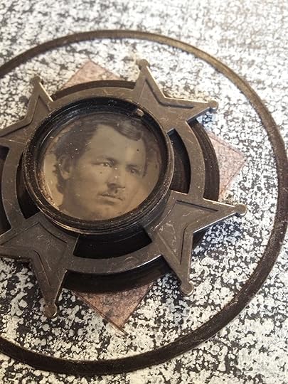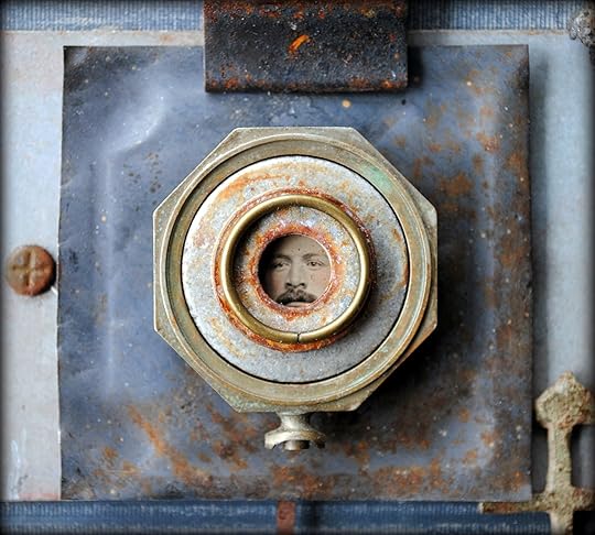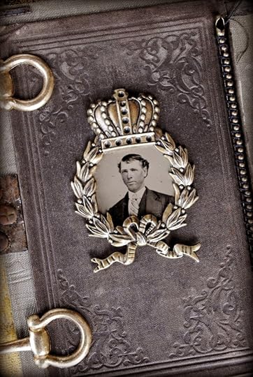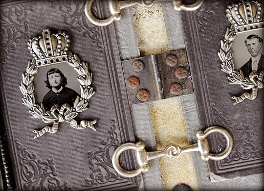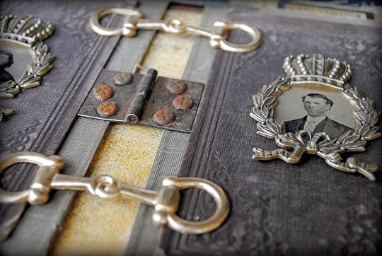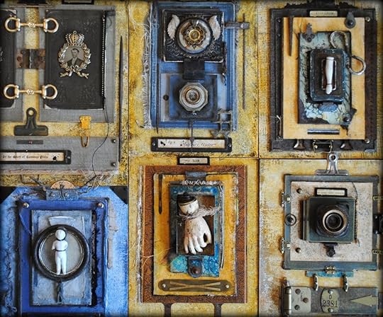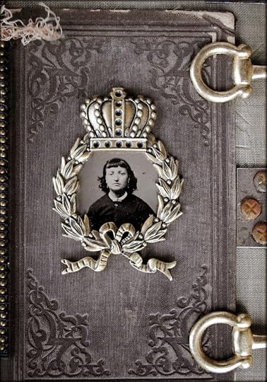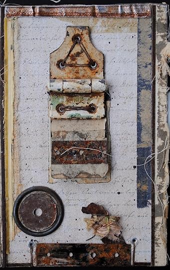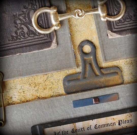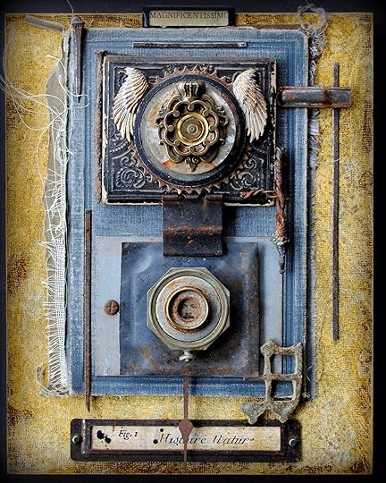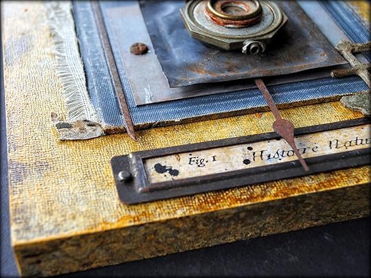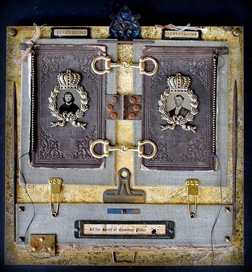 Also included are vintage book covers, vintage tintypes, found and altered metal, vintage paper, and fabric fragments -- all mounted on a hand-painted, cradled wood panel.