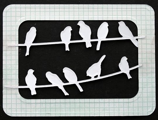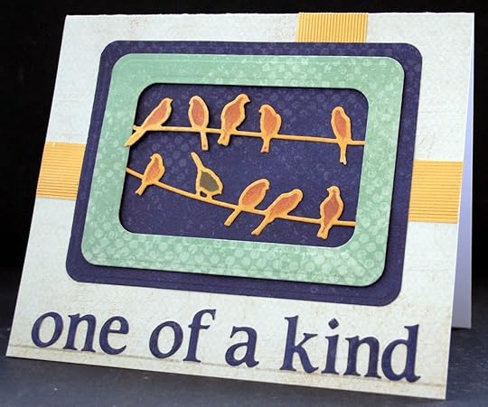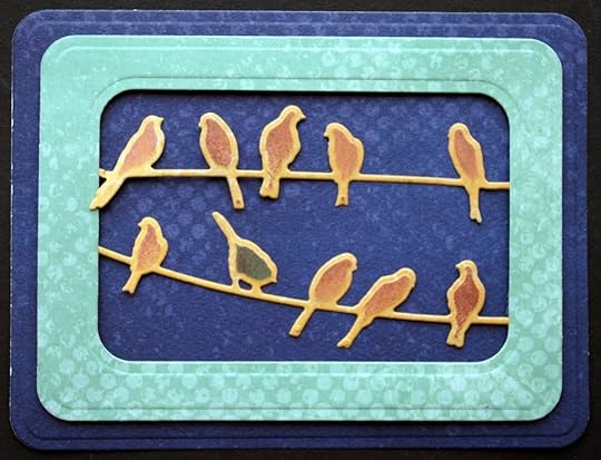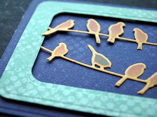 This card was inspired by Spellbinders new Birds on a Wire die. I die cut and embossed some decorative paper to start the project. Leaving the cut paper in the die, I used the die as a stencil and inked the birds as well. You will note that one bird is in a different shade.