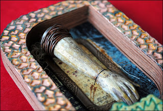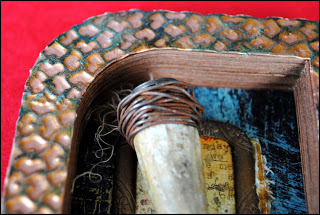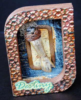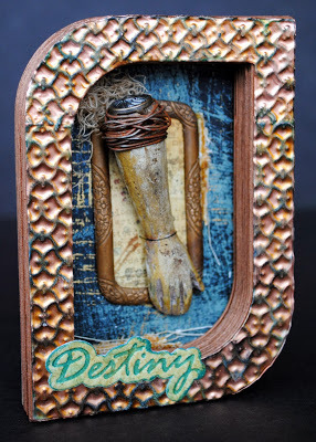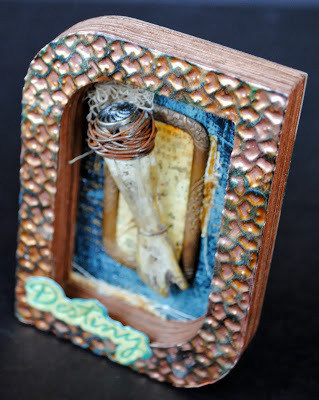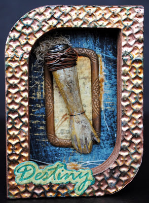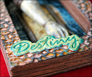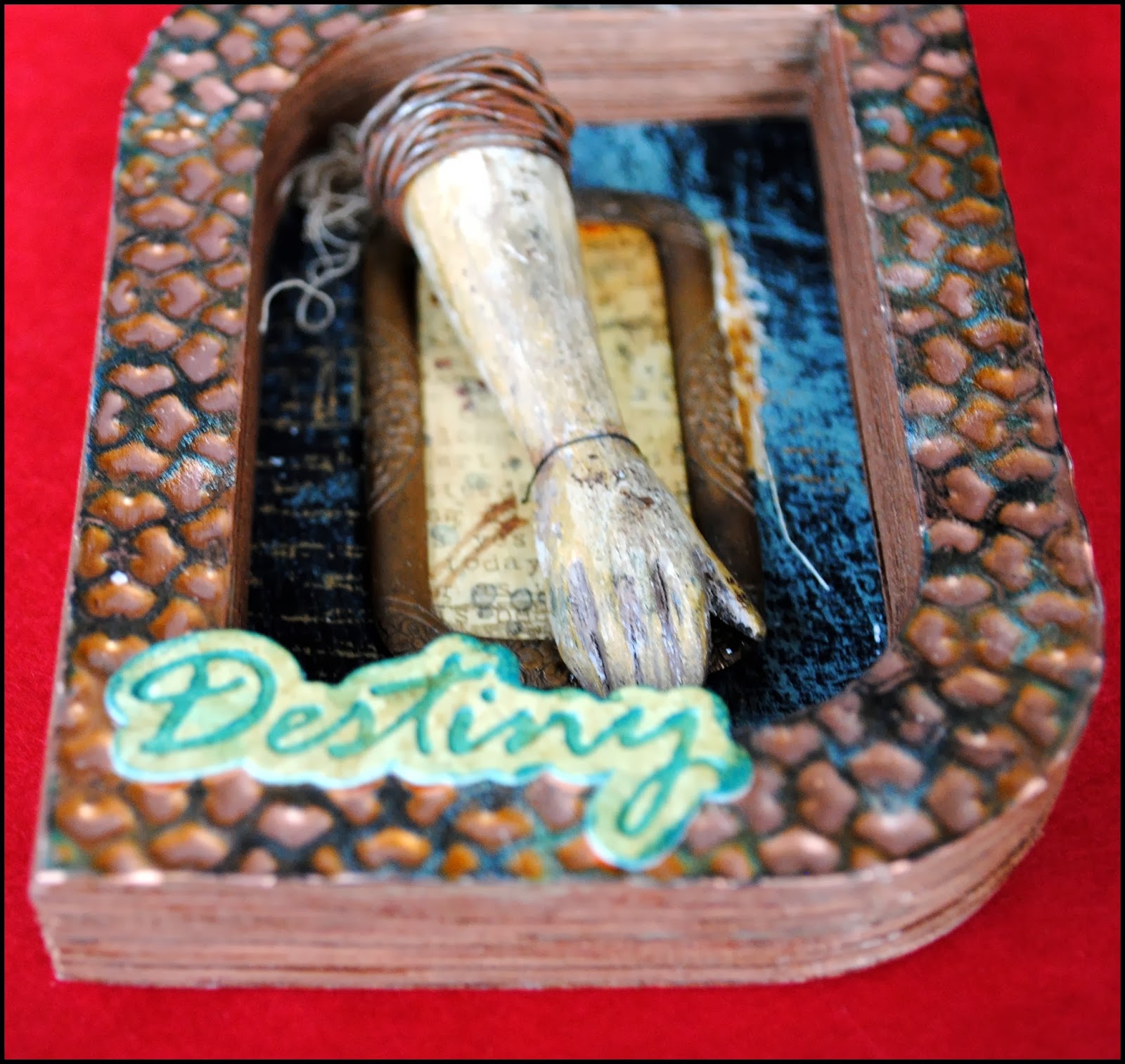 Once the niche was completed, I hand painted the hand (pun intended) and gathered bits and pieces from my mixed media stash: metal embellishments, rusty wire, painted paper, fabric bits, and frayed book binding material. I used these to create my artwork for the niche. As a final touch, I die cut, embossed and stenciled the word Destiny from Spellbinders Sentiments die set.