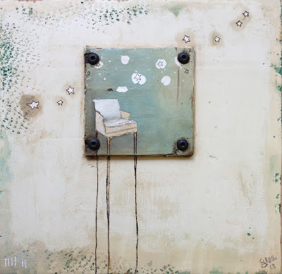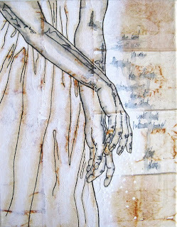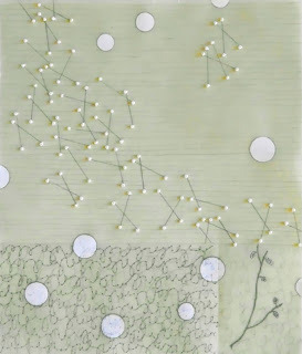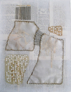 I have loved Patti's artwork -- and particularly her unique style -- since first seeing it online many years ago. She combines paper, stitching, drawing, mark making, and painting to create the most ethereal works of art that often seem like a precious piece of ephemera. She often uses symbols and mixes abstract shapes with representational objects. They all have a sense of being figurative snapshots from a dream or a memory.