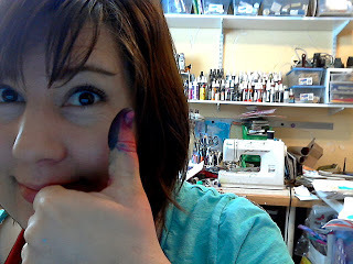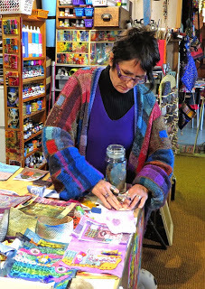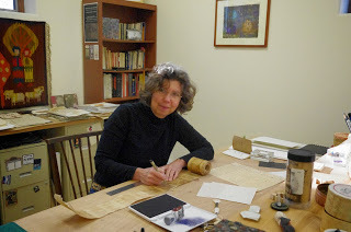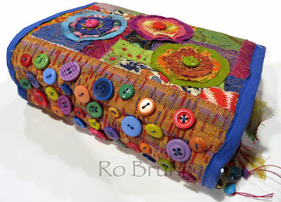When I think of Ro I think of color. Full, bold, bright, in-your-face-color (see photo above). Ro and I have connected online since 2007 and I have always admired her incredible, one of a kind journals created from her own hand-colored papers. But her work in jewelry, fabrics, and painting are equally amazing. And always bursting with color! Ro is from Australia and I hope to meet her when I head there to teach next year.