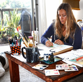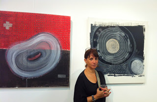 I met Karin in NYC when we were both exhibitors at the Parallax Art Fair in 2012. I was immediately drawn to her bold, graphic pieces that seemed to take on a life of their own. I found her repetitive use of shapes and confident use of color to be mesmerizing and altogether fascinating. Each piece is its own unique world that is very easy to get lost in. I was thrilled when she agreed lend her voice to the pages of my book.
