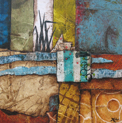 I have loved CW's work for many years, so much so that she was one of the first artists that I spotlighted on my blog back in 2007. She also participated in the original online version of The Pulse in early 2008. It is with great satisfaction that nearly 6 years later she is a part of this book. There is something special in her abstract works that absolutely fascinates me. Perhaps it is the combination of her color choices and color blocking, the surface layering and texturizing, the bits and pieces she adds, and her use of organic imagery. Or perhaps it is the stories that her artwork tell.