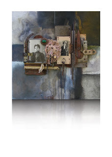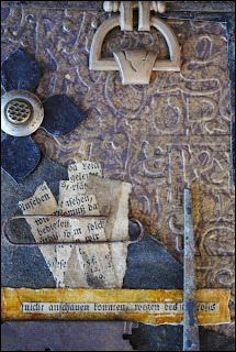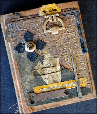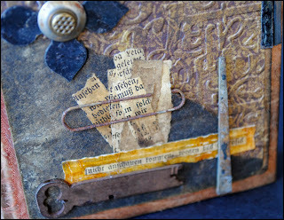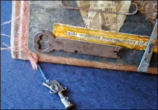 And then I went to mixed media heaven, adding found rusty metal objects, a vintage key, altered paper, and other embellishments. I continued until I felt my journey was complete. My souvenir from my travels in art was The Odyssey...