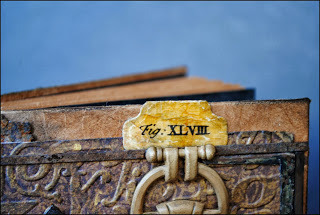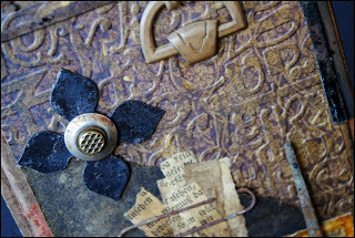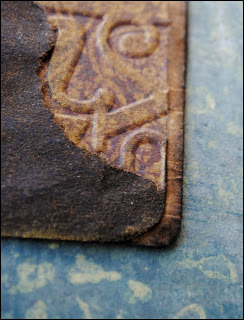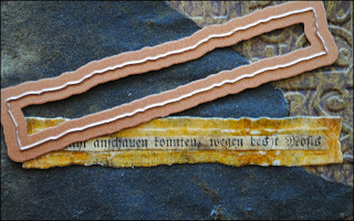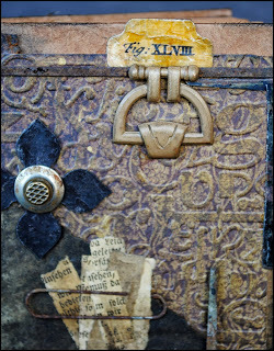 I headed back to my Spellbinders collection and cut a piece of hand painted paper using a die from their A2 Distressed Edges set. I added some ink for dimension and adhered some ancient text from a very old book that I got at a flea market in NYC.