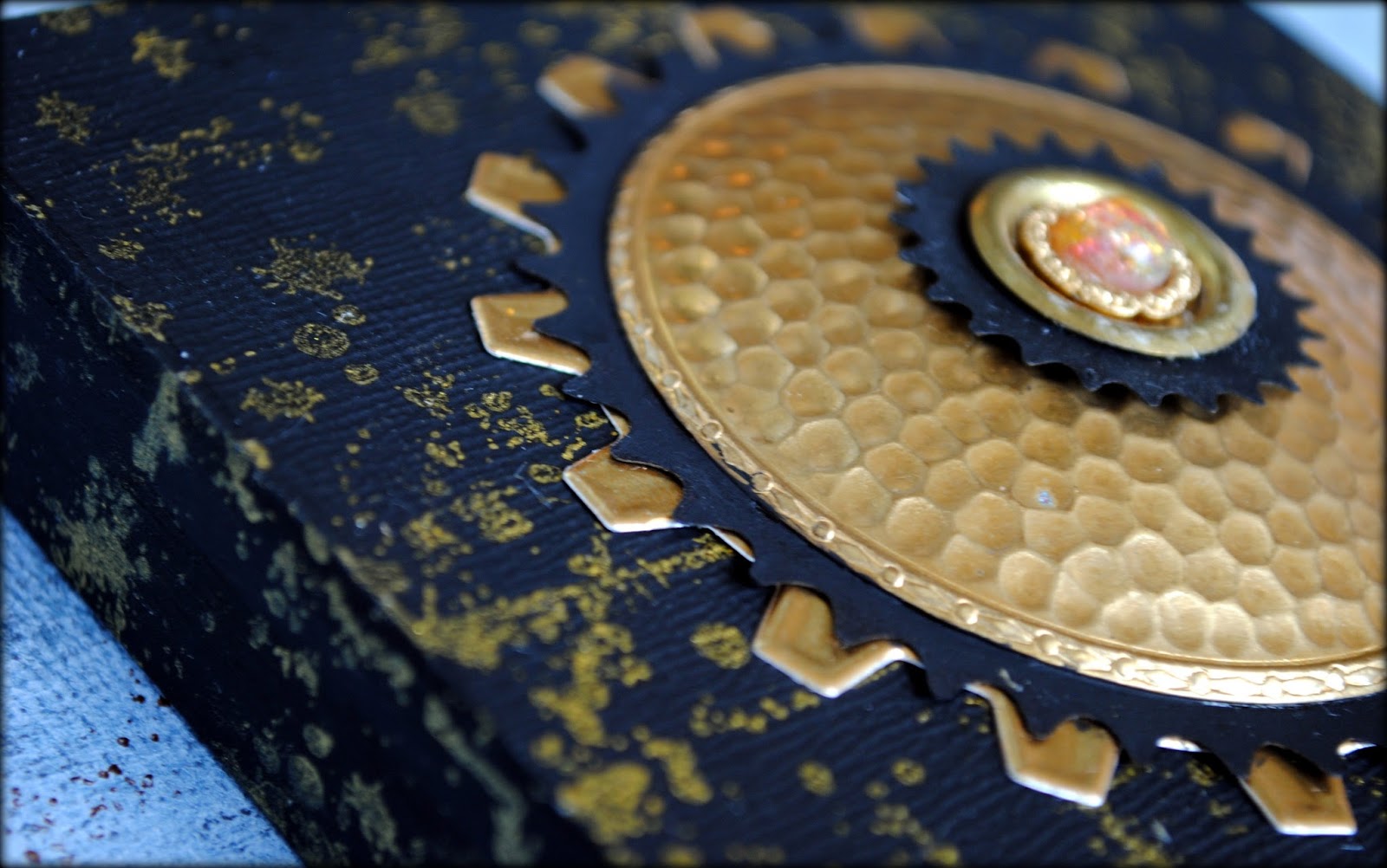 I altered each of these pieces by edging them with gold metallic pigment ink and a border of black ink, created by using the inside of each die as a template. I ran the gold ink pad around the edge of the book cover for more contrast as well.