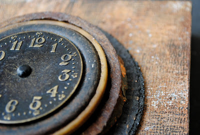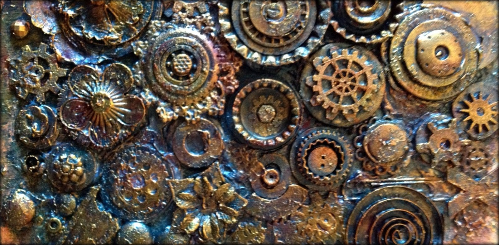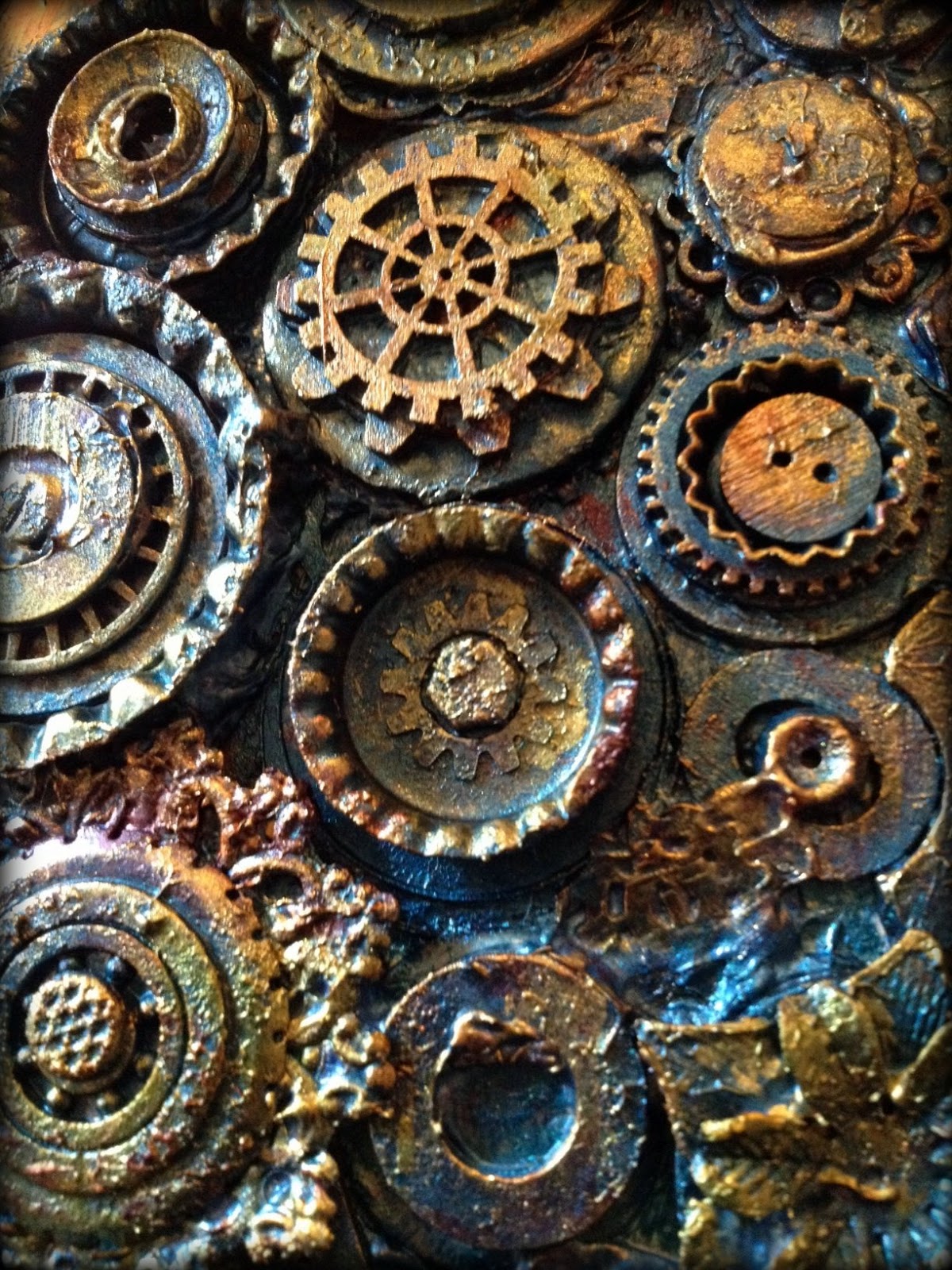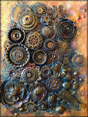 We used one of the books that Finn designed as the basis for the project. We created front and back book covers using the embellishments that she provided, objects that we brought (my usual stash of rusty washers, watch parts, gears, etc.), and paint. And more paint. We ended up with a garden of textural delight.