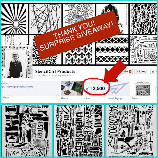 StencilGirl Products is celebrating their 2,500th Like on FB. To celebrate, they have announced a surprise giveaway. One lucky person will win all 3 of my newly released stencils. You can see the designs at the bottom of the following image.
