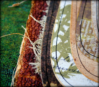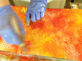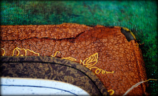 I went hunting through my piles of hand painted paper and found the perfect color match for this piece. I wrapped it around a piece of book board to create a stable backing.