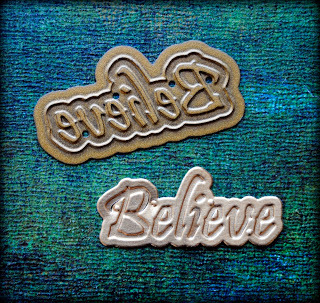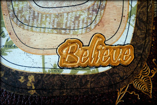 I used one of the dies from Spellbinders new Sentiments set, which includes 14 descriptive words in text. In keeping with the color theme, I cut the word believe out of gold foil. I knew that when I attached it I would outline the word in black ink to make it pop.