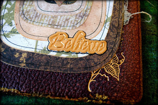 Believe was inspired by a vintage book cover that has been in my collection for some time now. I loved the textured book cloth, the naturally brittle and distressed edges, and the beautiful gold embossing. The dark patch of color does not read as bold in real life.