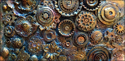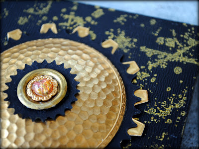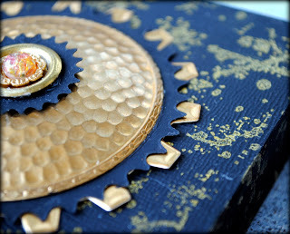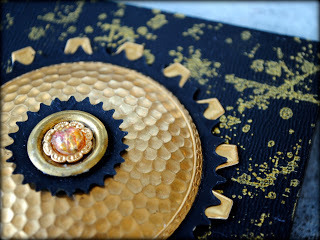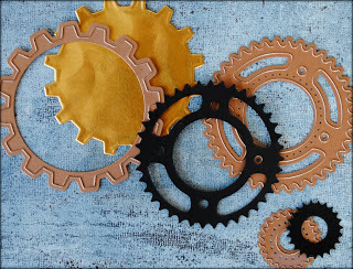 I then dug into my collection of Spellbinders dies and selected a number of dies from 2 of my favorite sets: Cogs and Sprightly Sprockets. I chose some black cardstock and gold foil to match the colors on the panel.