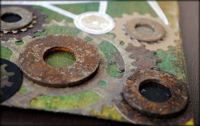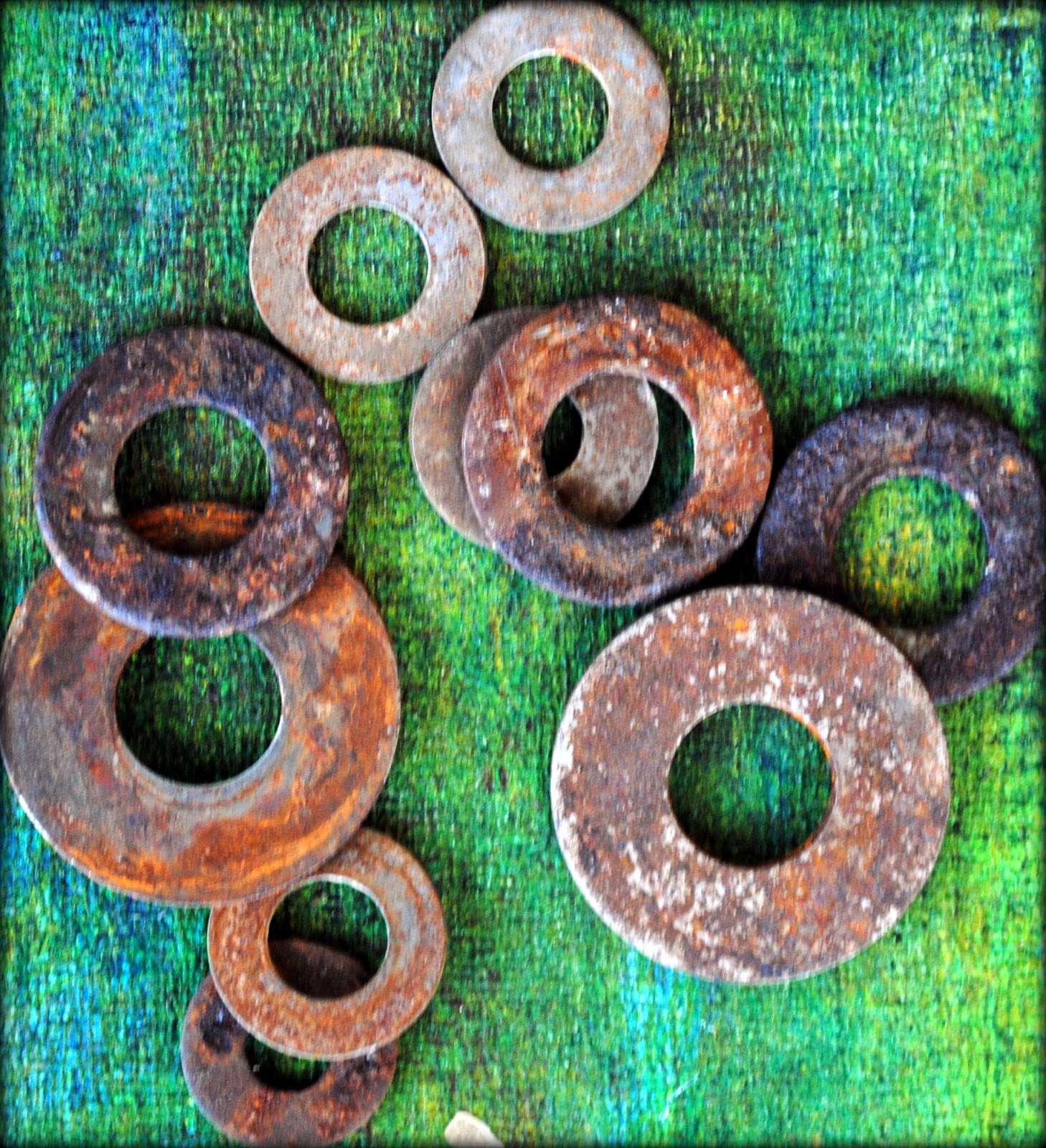 I have a huge pile of metal hardware, both found and bought/altered and I scooped up a batch of rusty metal washers.