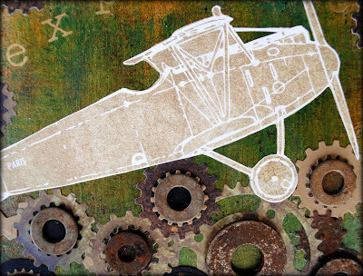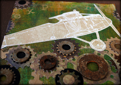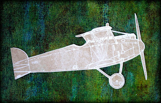 Next I decided to find a focal image that echoed the theme of exploring. I found a great image of a plane, which I cut out from a 12 x 12 inch piece of patterned paper from the Off the Wall Collection: Travel from 7 Gypsies.