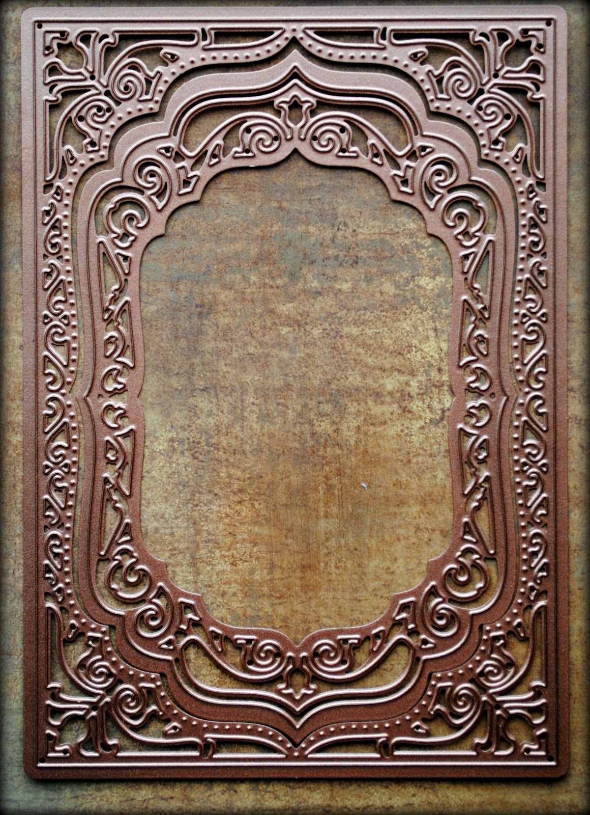 I wanted to echo the Victorian-feel of the tintype in the piece, so I decided to use dies from Spellbinders to create both a frame and a background. For the background, I nested two dies from the Elegant Labels Four set...