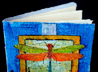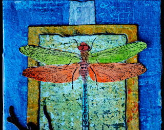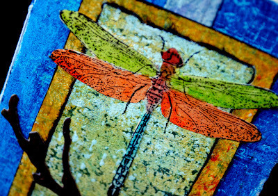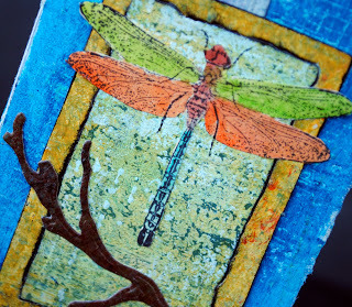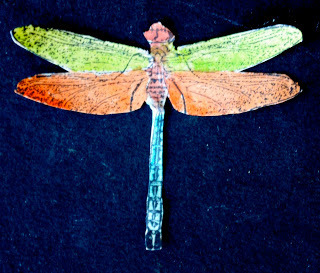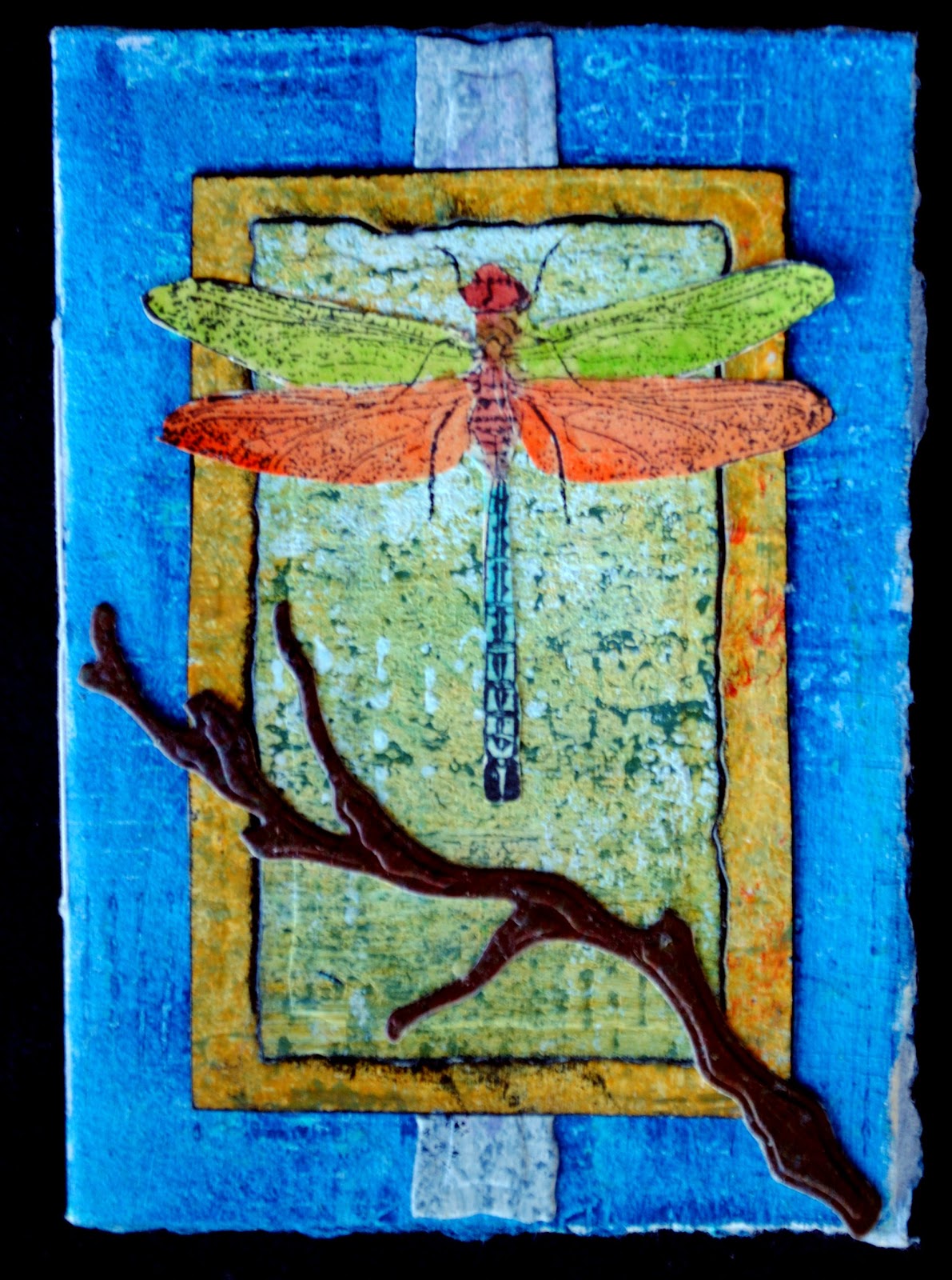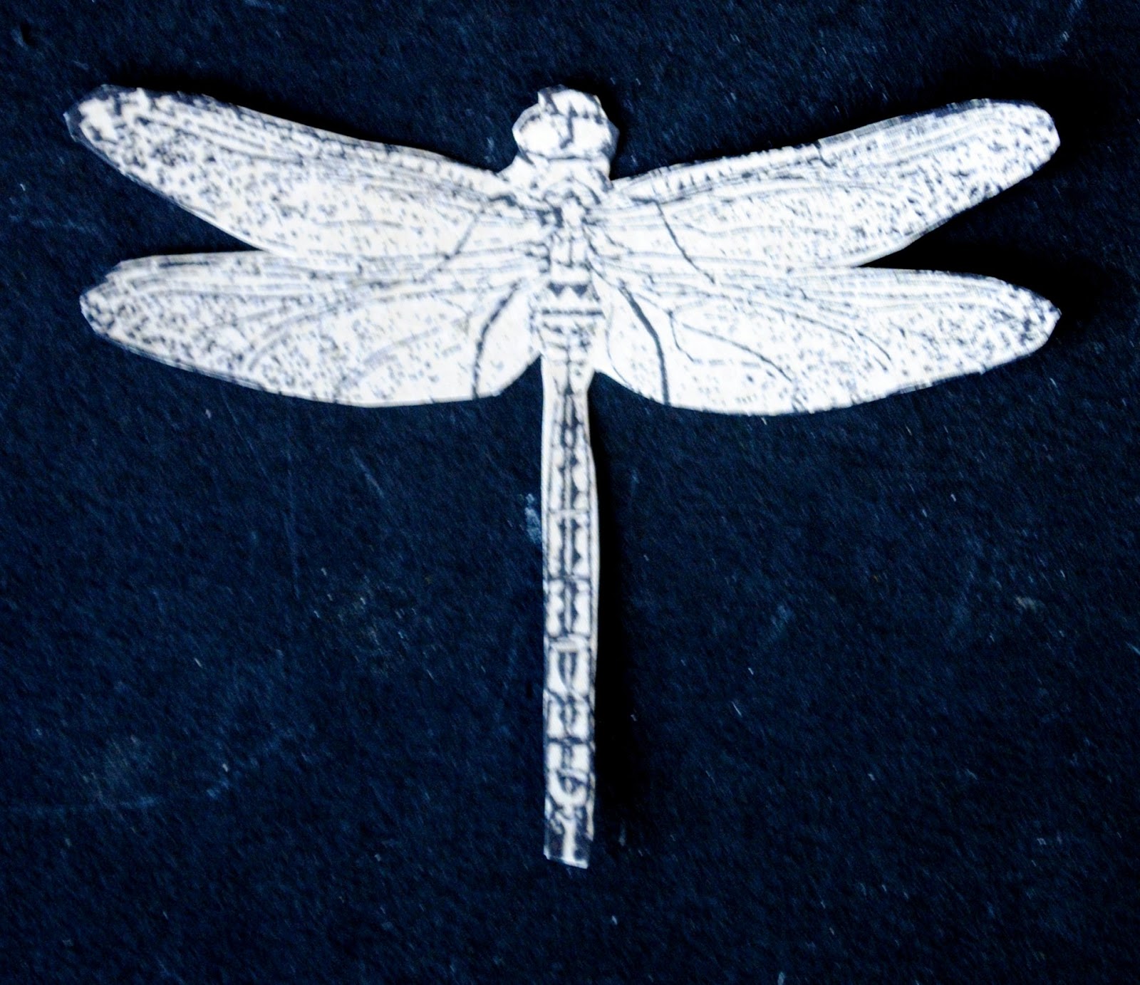 Using one of my favorite rubber stamps and ink, I stamped an image of a dragonfly on parchment colored paper.