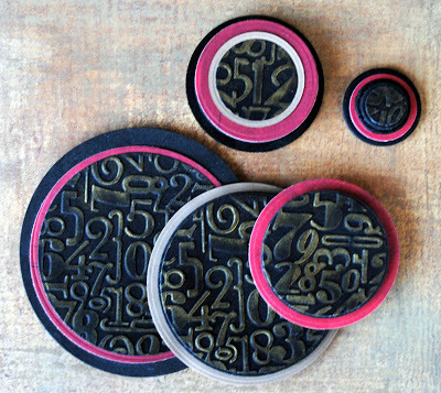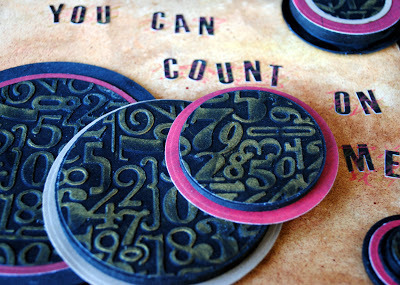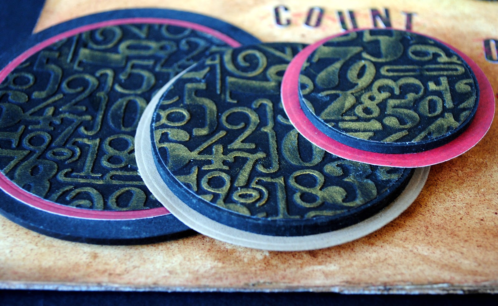 I then went ahead and die cut multiple-sized circles out of the sheets of embossed letters, kraft-color card stock, and red decorative paper.