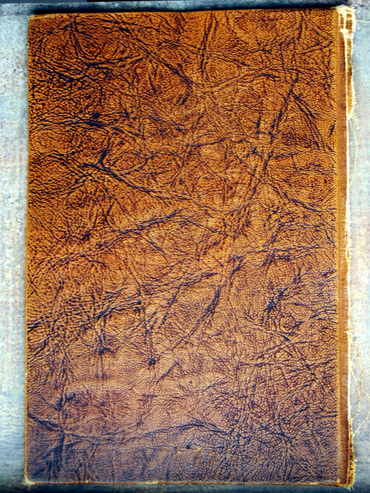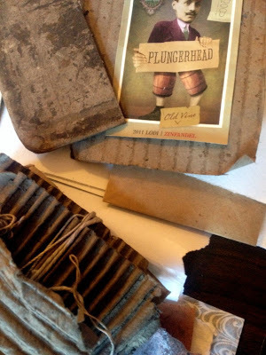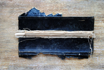 In keeping with the age of the tintypes, I decided to use vintage book cloth torn off of vintage book covers as one of the ingredients. I love the natural fade to the bluish-green book cover and the textured brown of the leather-like cover.