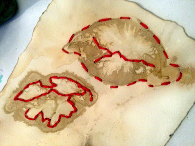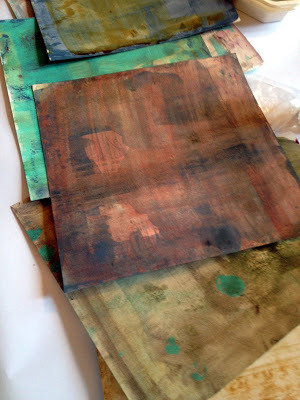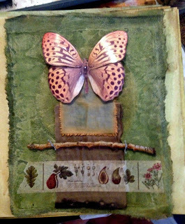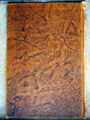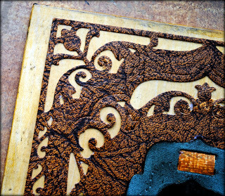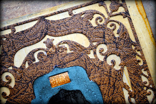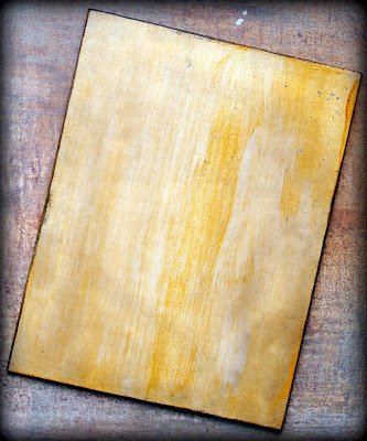 To stay true to the source of the book cloth, I decided to use a piece of book board, cut to approximately 7" x 5.5", as the substrate for this piece. I covered it with light weight paper and painted the surface an amber shade with acrylic paint. It was distressed a bit with dye ink as well.