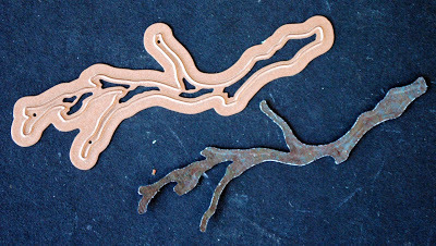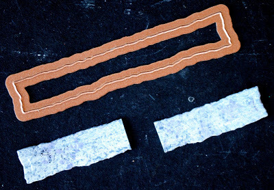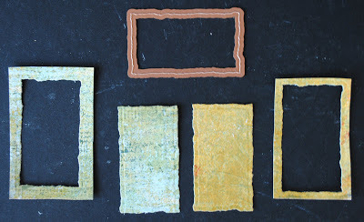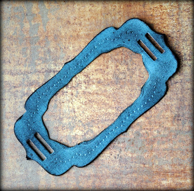 For the tintype frame, I used the third die from the same set and used it to cut the bluish-green book cloth, also pulled off from the book cover. I cut the same shape from a piece of card stock to glue behind the book cloth to make it sturdier.