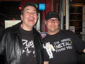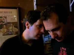 (Senor Dorkinger [left] and Rod Moody, outside of the Sunset following the Squirrels’ and Young Fresh Fellows’ show, April 2012.)