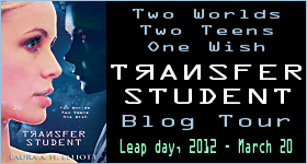 Author Laura Elliot is on the blog today for a cover reveal of Transfer Student, which releases March 20th. Tweet and follow her blog to enter her bookmark giveaway (see below). TWO WORLDS. TWO TEENS. ONE WISH.