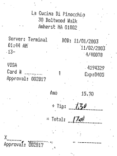 Another rumor can be confirmed. Maura Murray was caught using a stolen credit card number in early November, 2003, according to documents received today from Amherst Police.According to the police reports, in early November, a female student at UMass discovered some odd charges on her credit card statement. Someone had been using her credit card number to order take-out from Pinocchio's Pizza. After calling the credit company, this student called Amherst Police who then contacted Pinocchio's and two other area pizza restaurants. After checking their records, Pinocchio Pizza managers found that the orders had been delivered to Maura's dorm room. That very night, shortly after Pinocchio's was made aware of the fraud, Maura called and again tried to use the same number. Officers enlisted the deliveryman in a sting in which he would present the bill for Maura to sign. When she did, the police approached her dorm room.