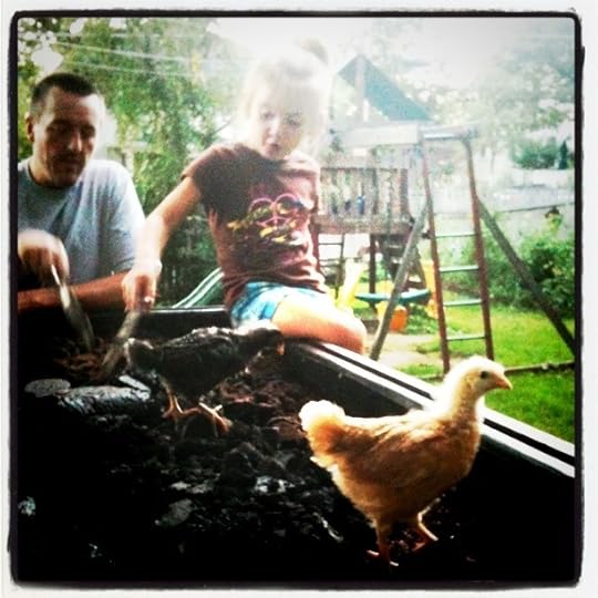 Josh still has the chickens in his living room, which he says is becoming mildly problematic because they're getting really big already and they're literally trying to fly the coop. They've already ripped through a 5-pound bag of feed and have about doubled in size. Their "output" is equally prolific. So we've got that to look forward to when they move over here.