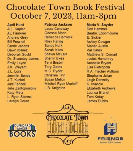 Booklovers descend on Chocolate Town (aka Hershey PA) this weekend for the annual Book Festival and I’ll be part of it! Held at the Hershey Public Library, dozens of authors on fiction/non-fiction, genres and more will be there to meet readers, sell and sign their books and more.