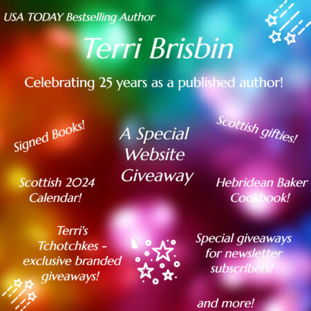 I’ve got signed books, 2024 Scottish calendars (weekly giveaways!), Terri’s branded tchotchkes, Scottish goodies and even a Hebridean Baker’s cookbook! And more. And all you have to do is enter on my CONTEST page. If you’re already a newsletter subscriber, there’s a special giveaway for you that will be in the upcoming issue early next week – don’t miss your special drawing!