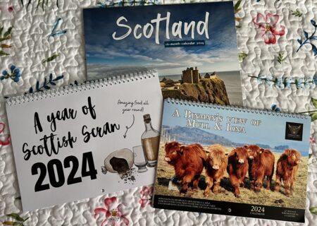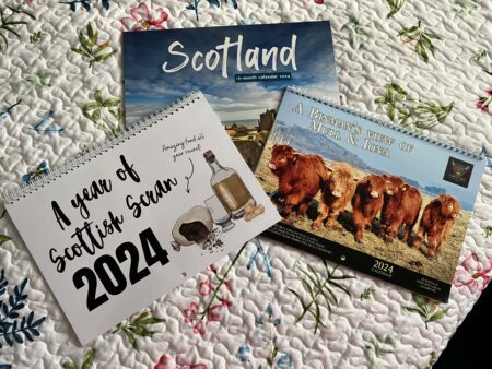 For my giveaway, I’m giving one winner who makes a comment below a lovely 2024 Scottish calendar along with a wee Scottish giftie, too! So just tell me if you bake or make Holiday treats or just like to eat them or what your favorites are and I’ll choose a winner who will be announced on December 13. Could be one of these calendars below or another of the ones I’ve collected for the New Year! Good luck!