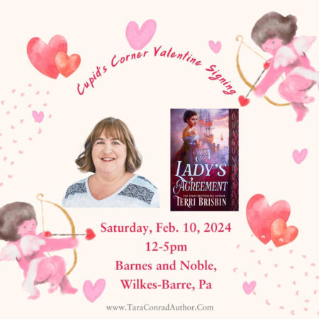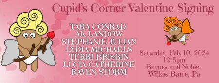 It’s true – February and especially Valentine’s Day and its celebration belong to ROMANCE AUTHORS and READERS! So, to mark our special time of the year, Terri will be joining authors Tara Conrad, Stephanie Julian, Lydia Michaels, AK Landow, Lucia Catherine and Raven Storm at Cupid’s Corner — aka the Barnes & Noble in Wilkes Barre PA – on Saturday, February 10 from Noon till 5pm!