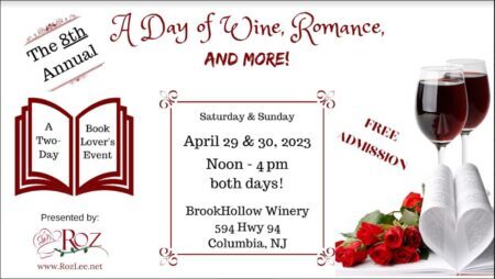 On Saturday, April 29 and Sunday, April 30, 2023, I’ll be signing as part of author Roz Lee’s Days of Wine and Romance and More at the Brook Hollow Winery in Columbia, NJ! Featuring more than 30 authors who write romance, mystery and more, there’s also wine tasting available, door prizes and gifties. And, books, did I mention books? LOL!