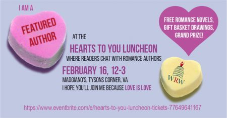If you’re in the MD-VA-DC area, I hope you’ll join me and other romance authors and readers to celebrate LOVE!! The Washington DC Romance Writers are hosting this annual (but moved from the Fall) luncheon that features local authors, lots of food, fun and romance novels, too. And did I mention gift baskets? Oh yes!