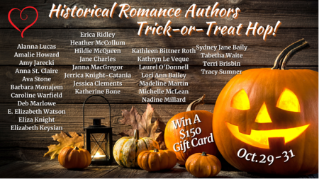 30 historical romance authors are doing a Halloween Hop from October 29 – 31st! Visit the FB party page and find links. Follow links to find our favorite Halloween treats. Report those candies/treats and you have a chance to win $150 gift card! Woohoo! Join our FB group here and get ready for Trick or Treat!