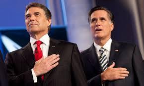 Perry tries to prove he's a better American than Romney by placing his hand higher over his heart.