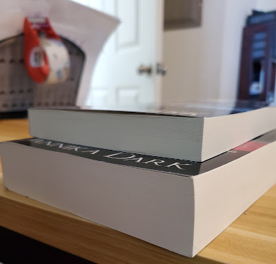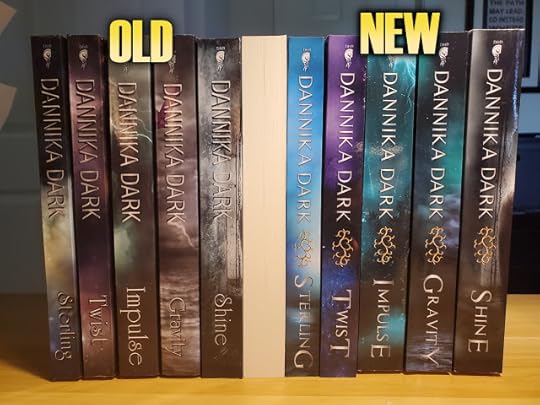 Apologies for my not-so-great photography. Someday I will learn to take Instagram-worthy pictures, but today is not that day. The original covers are on the left, the "enhanced" paperback covers are on the right. Please note that the alignment is perfect with the author name and symbols; the end books are slightly off center since they are sitting on a bookend.