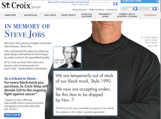 It seemed more than a little creepy when this company in Minnesota jumped all over the news of Steve's death and ran a huge promotion on a black mock turtleneck and then saw its sales explode. The guy who runs St. Croix actually told a reporter that Steve Jobs was a customer — but then the company had to back off those claims after getting busted by TMG and others after Steve's biographer, Walter Isaacson, revealed that Steve got his mock turtlenecks from Issey Miyake. Oops.