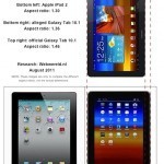 Allegation is that Apple created images where they changed the dimensions of the Samsung Galaxy Tab to make it look more like the iPad — to convince a German court that Samsung's product is a clone and a ripoff. Hard to believe that Apple would do this. The GT may violate all sorts of Apple patents — who knows? — but in terms of physical size you would not mistake one for the other. Nevertheless, Computerworld has the photos and makes the case against Apple.