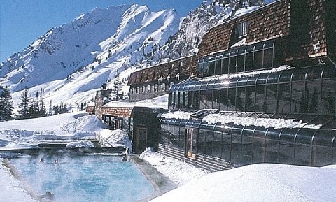 And: the place sits at the foot of Alta, which is a pretty tough location to beat. There is nothing to do at Alta except ski. There's no shopping. No "base village" to speak of, and no restaurants apart from the ones in the handful of ski lodges. At the Peruvian there's a big living room with old couches and chairs and a fireplace and a machine that makes coffee and hot chocolate. There's an outdoor pool and two hot tubs, and every afternoon they put out free snacks and people roam around in white robes and flip-flops. There's a big screen TV in a room downstairs, where you can watch TV with other people. The only entertainment nearby, advertised in a flyer on a bulletin board, was a production of "Romeo and Juliet" by some local schoolkids, put on at "Our Lady of the Snows," a little concrete chapel on the canyon road. The meals are pretty good, but there's a catch: you get seated with a bunch of other people, which is something you either love or you hate.