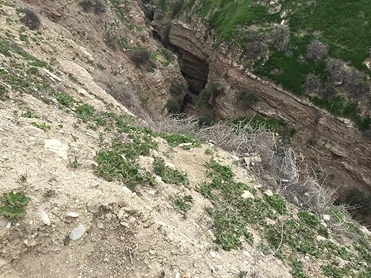Staring into the abyss.The question was, How the f*ck did she get down there? I studied the cliff. It was a sheer drop off of at least 300 feet. I walked along the entire length of the bluff looking for a trail. There were little gullies where maybe someone with suicidal tendencies might scramble down, but these paths were better suited for ground squirrels or geckos. I finally found what looked like an established trail at the south end of the cove. I stood at the top of it and stared down into the abyss. The trail snaked down the vertical wall of a canyon, formed by a creek that flowed out to sea. Just imagining myself going down that trail made my stomach seize up into a knot and my heart rate double. That could not possibly be the way that woman and her dog got down there. It just couldn’t be. Who in their right mind would want to be on that beach so badly as to endanger their life—and, as I was picturing—their dog’s life?Me. That’s who.